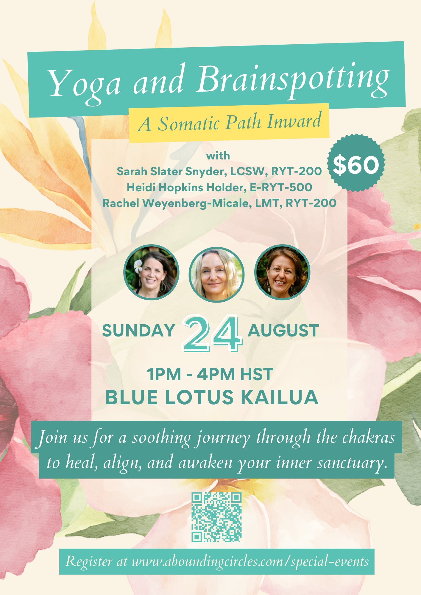 Sarah Slater Snyder (LCSW, RYT-200), Heidi Hopkins Holder (E-RYT-500) and Rachel Weyenberg-Micale (LMT, RYT-200) will guide us through a healing, high-vibe, in-person workshop blending three unique wellness practices: Gentle Yoga through the Chakras, Ultimate Restorative (integrating restorative yoga and yoga nidra), and Expansion Brainspotting.